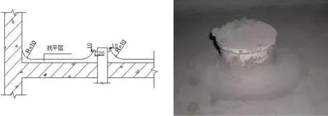 管根、墻角管根及墻角處抹圓弧,半徑10mm。管根與找平層之間應(yīng)留出20mm寬、10mm深凹槽。