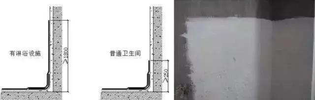 高度地面四周與墻體連接處,防水層應(yīng)往墻面上返300mm以上,有淋浴設(shè)施的廁浴間隔墻面,防水層高度不應(yīng)小于1.8m。