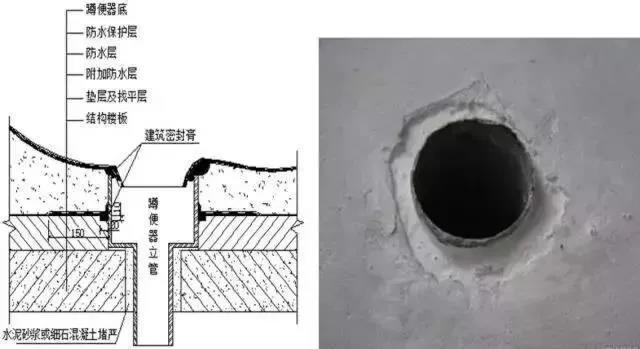 蹲便器管根與混凝土(水泥砂漿)之間應(yīng)留凹槽,槽深10mm、寬20mm,槽內(nèi)嵌填密封膏;蹲便器底部與立管相接處應(yīng)加設(shè)密封膏。